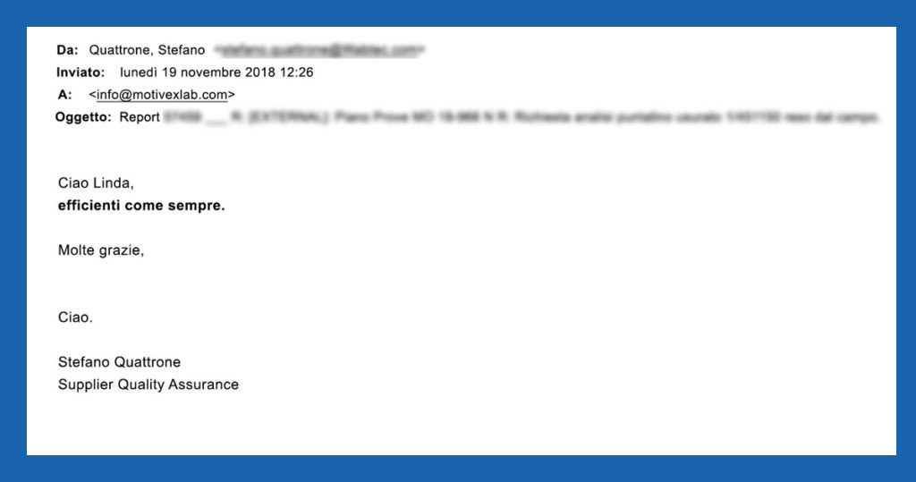 E’ importante rispondere in tempi brevi alle richieste del mio cliente perché devo garantire la conformità dei pezzi, evitare eventuali fermi di produzione al cliente, con gli eventuali oneri che ne risultano.