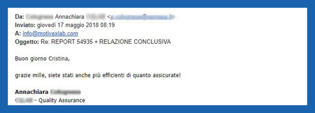 Al termine delle attività ho potuto confermare la mia impressione positiva che avevo avuto fino a quel momento: ho ricevuto report comprensibili, chiari, completi ed esaustivi, quindi assolutamente in linea con le nostre esigenze.